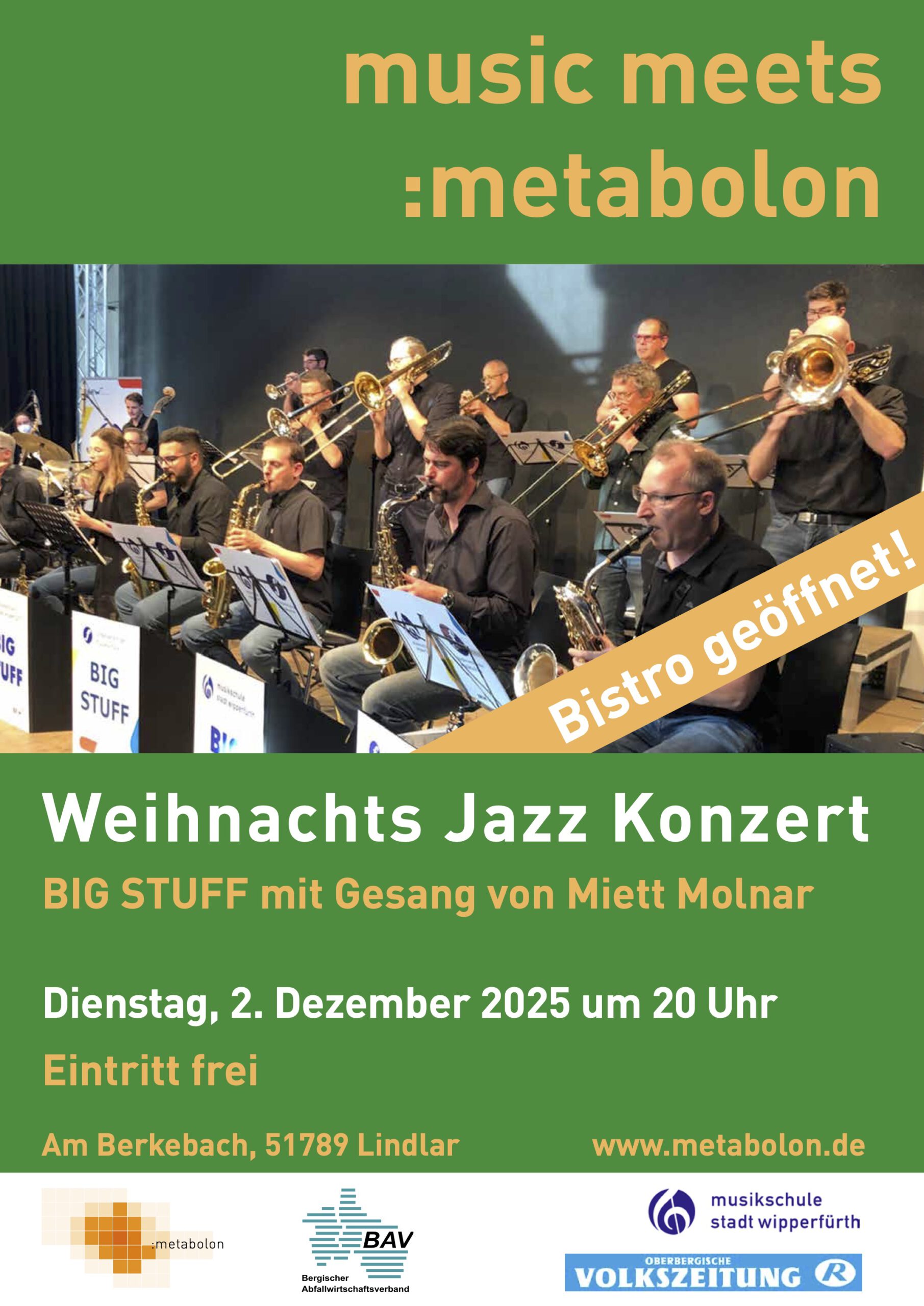 Von MusikschuleWF|2025-11-11T09:09:59+01:00November 11th, 2025|Kommentare deaktiviert für Kategorie: General music meets :metabolon -Weihnachts-Jazz-Konzert mit Big Stuff feat. Miett Molnar